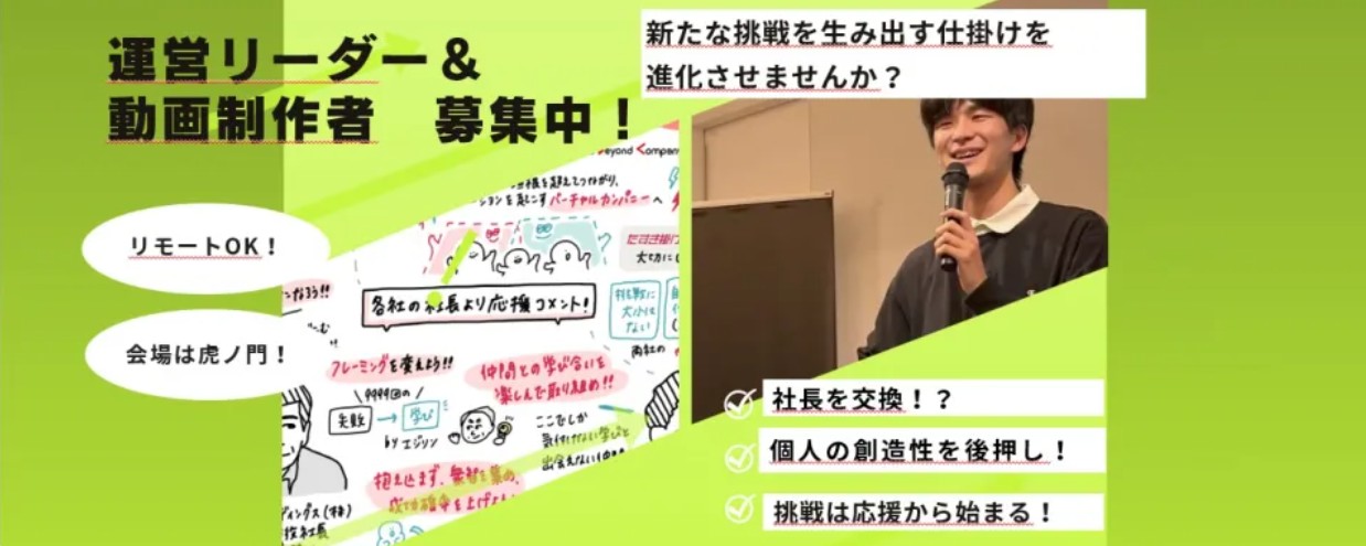 場の空気を作り上げる運営リーダーと、その空気を映像として記録しさらに熱量の渦を大きくしていく動画制作するクリエイターの方、エントリーお待ちしています!