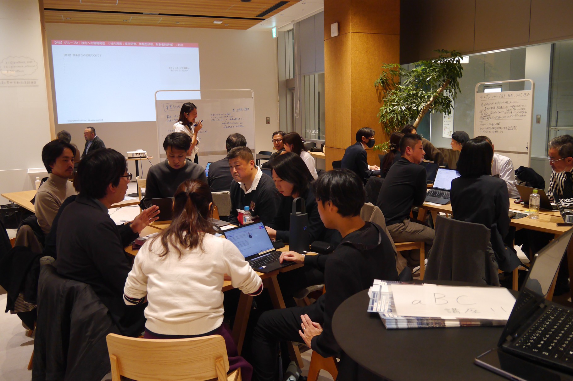 講義の後半では、参加者が「情報収集」「事業計画」「社内浸透」「CSV」のテーマごとに分かれ、自社の課題を共有するワークショップを実施。企業の枠を超えた熱量の高い議論が交わされました。
