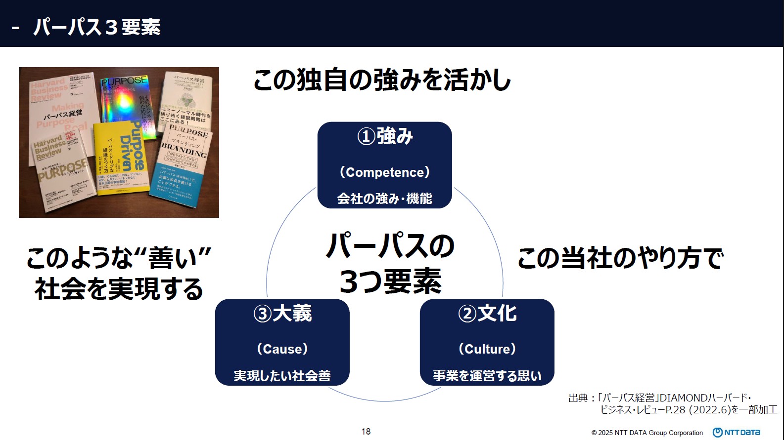 企業の存在意義(パーパス)は、美辞麗句を並べるだけでは機能しません。金田さんは、社員が腹落ちし、独自の勝ち筋が見えるパーパスの条件として、以下の3要素の欠かせない統合を提示しました。