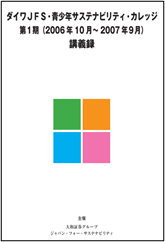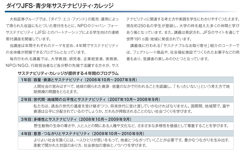 2006年10月、大和証券グループ本社と大和証券投資信託委託(現ダイワアセットマネジメント)は、ジャパン・フォー・サステナビリティ(JFS)と連携し、大学生を対象とした「ダイワ-JFS青少年サステナビリティ・カレッジ」(以降、「サステナビリティ・カレッジ」と表記)を開講した。公募で集められたサステナビリティに関心のある大学生約40人に対して、月1回の頻度で4年制大学よろしく4年間で計48回、毎回異なる外部有識者が講師となってサステナビリティの諸相を包括的に解説するプログラムである。大和証券グループ本社セミナールームを会場として活用し、運営費には、「ダイワ・エコ・ファンド」の純資産額を参考に算定された寄付金が充てられた。企業とNGOが連携して「サステナビリティ」という看板を掲げて講座を展開するという意味では、日本初の試みであった。